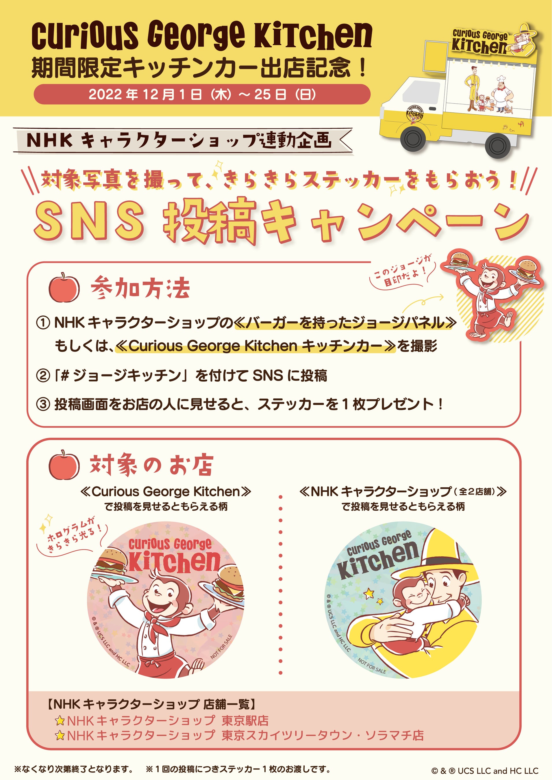 また、Curious George Kitchen キッチンカーをご利用のお客さまには、楽しいプレゼントもご用意しています。さらに、同日からはNHKキャラクターショップと連動した、オリジナルステッカーがもらえるSNSキャンペーンもはじまります。