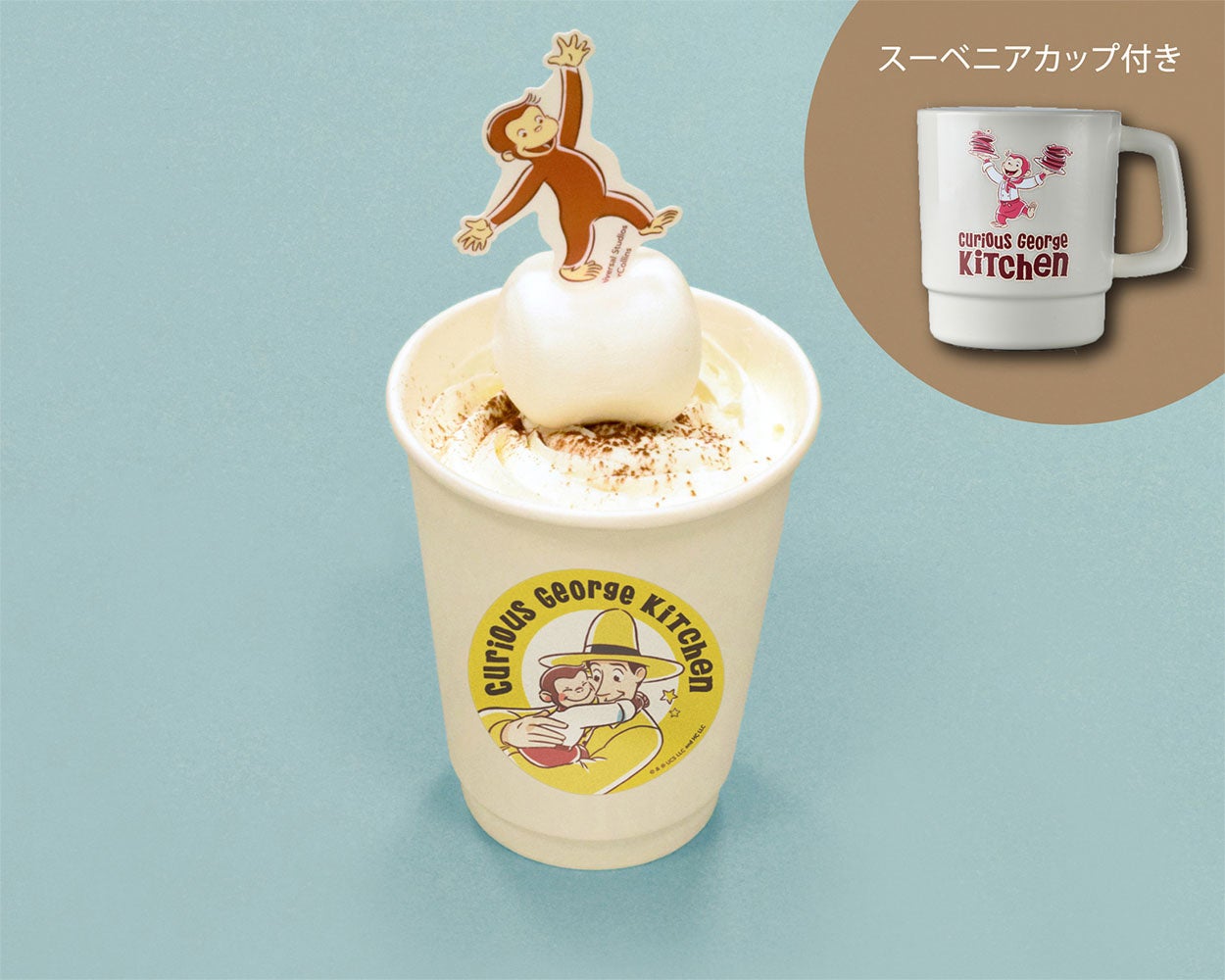Curious George Kitchenオリジナルのスーベニアカップがもらえる「ココア」もプレーン・バナナ・ベリーと3つの味からお選びいただけます。あたたかいココアの上で、マシュマロに乗り、ゆらゆらと揺れるジョージの姿が愛らしいひと品です。