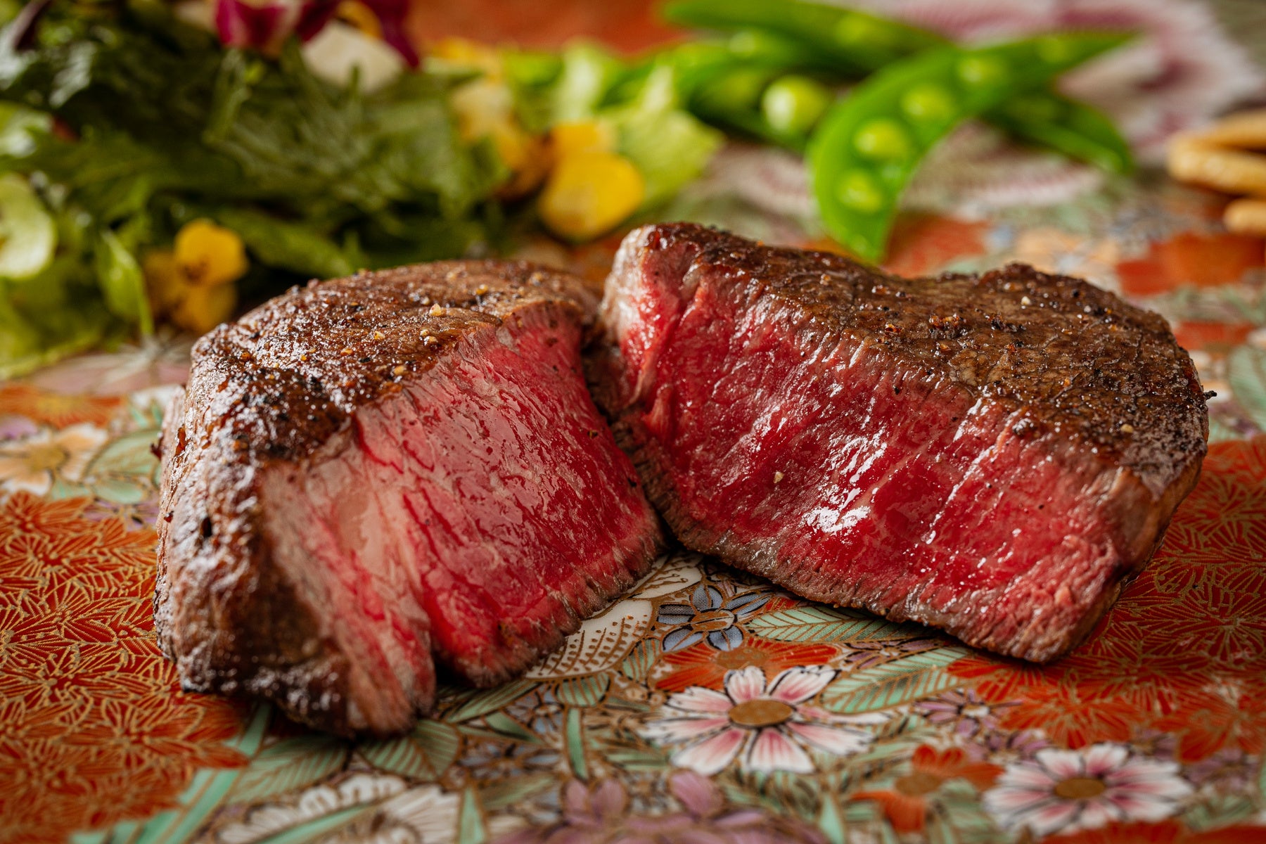 昨今の“霜降り至上主義”に異を唱え、人為的に脂肪を蓄えさせるのではなく、できる限り負担をかけず自然な状態で健康的に長期肥育された国産黒毛和牛を、和牛の目利き師と料理長が丁寧に吟味して仕入れています。ランクやサシの多さを基準とせず、本来あるべき黒毛和牛の肉の味と脂の質にこだわり、市場に出回らない希少な雌の未経産の黒毛和牛を限られた牧場産から厳選しております。色つやよくきめ細やかな肉質と上質な脂身は胃にもたれることなく、牛肉本来の美味しさをとことん味わえます。
