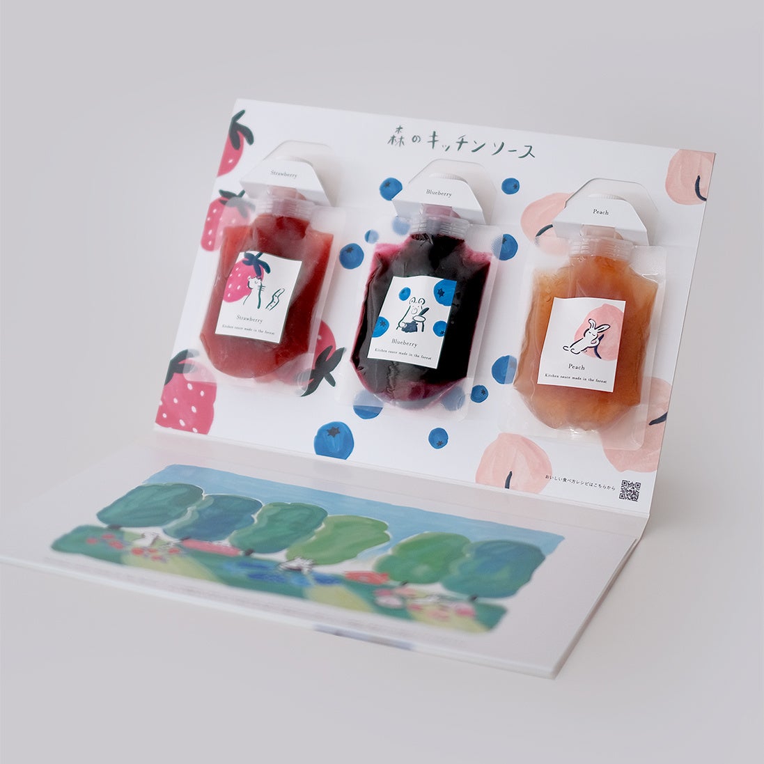 果実ソースを包むパッケージのイラストは、この商品のためにイラストレーターの熊木まりこさんに描き下ろしていただきました。熊木まりこさんはイラストレーターでありながら世界中を旅する旅人でもあります。世界の行った先々の風景を素敵にスケッチされており、独自のタッチ・独特な色彩で描かれるイラストは唯一無二の個性が光ります。熊木まりこさんの生き様や、自然体の自由なタッチは本商品と合致すると考え、依頼させていただきました。パッケージには、自然あふれる森やそこで自由気ままに暮らす動物たちがなんとも愛らしく描かれてます。BOOK型になっているため、そのままお部屋に飾ったり、好きな部分を切り離して額に入れたり、食べた後も目で見て楽しんで頂けるパッケージになっています。