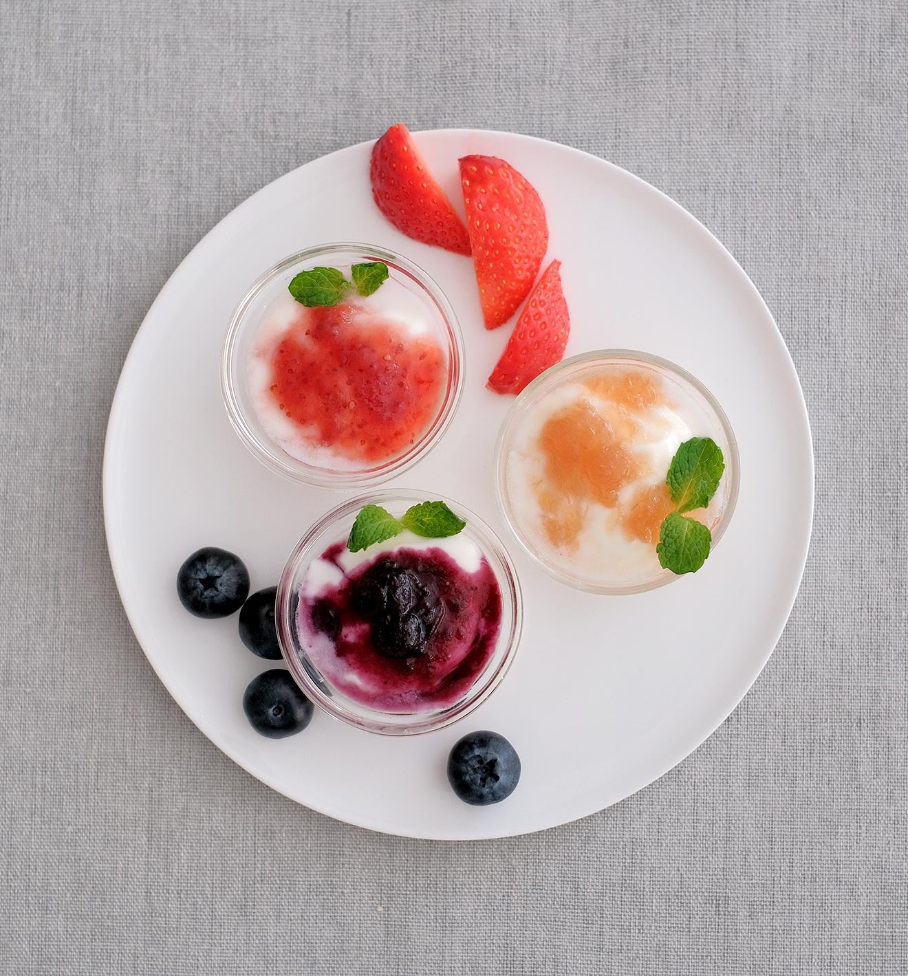 朝の食卓にピッタリな、いちご/ブルーベリー/桃の3種がセットになっています。いちごは福岡産のあまおういちご、桃も福岡産を使用しており、ブルーベリーも九州産を使用しています。いちごソースはあまおういちごを丁寧に煮詰めることで果肉と種のぷちぷち食感を残しながら、食物繊維やポリフェノールが豊富で濃厚な果実ソースとなっています。桃もブルーベリーも果汁たっぷりな果実ソースになっています。さらに、専門知識をもつ歯科衛生士が試作をくり返し、砂糖の代用として「イソマルオリゴ糖」を使用しています。これにより素材の味を生かしつつも歯にやさしい低糖度の果実ソースを実現することができました。従来のジャムよりサラサラしているため、パンだけでなく幅広い料理でお楽しみいただける商品となっています。
