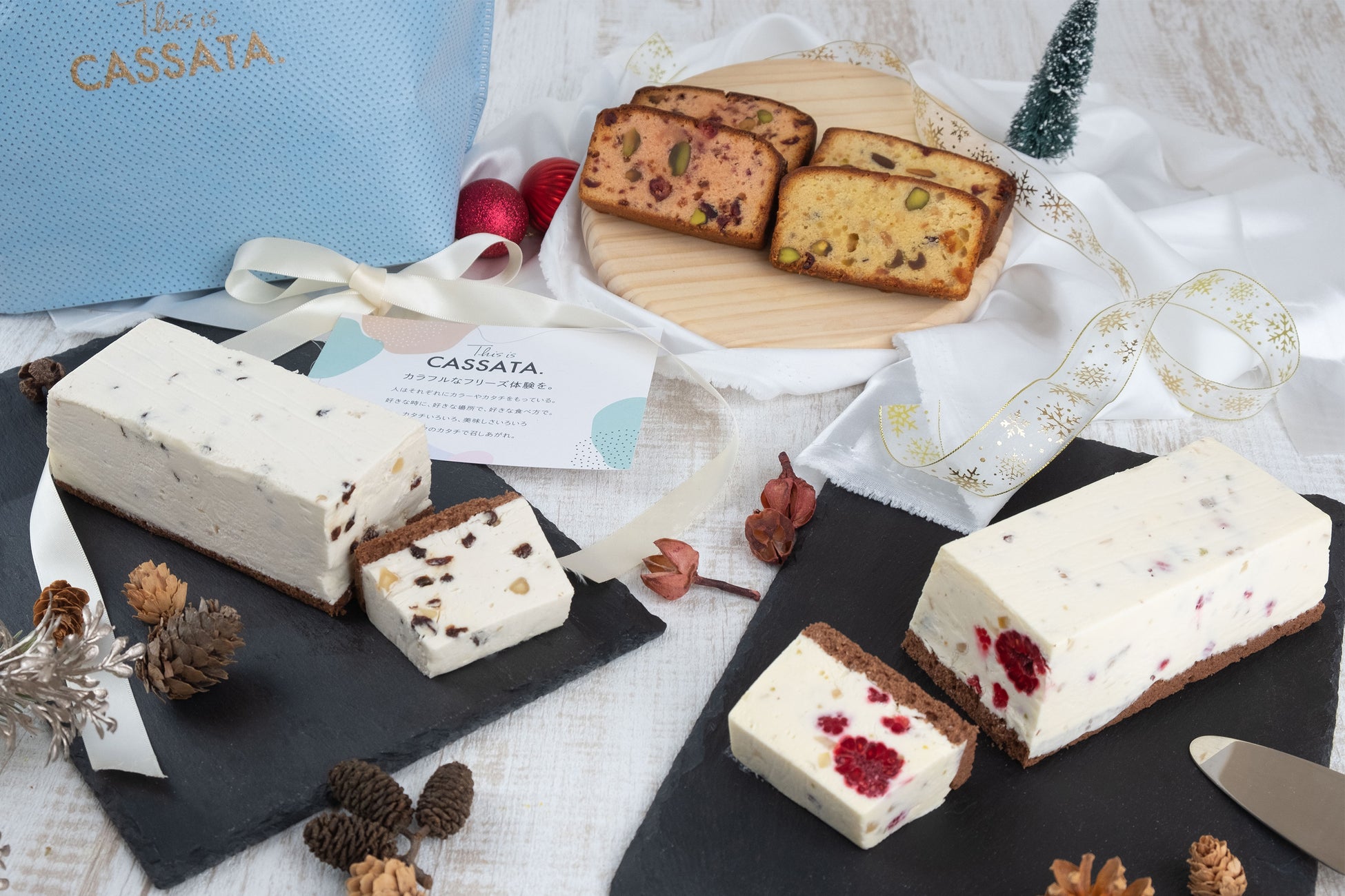 セットにはThis is CASSATA.定番のプレーンカッサータやラムレーズンのカッサータ、そして今回のセットのために特別にご用意した焼き菓子など、クリスマスシーズンをより一層お楽しみいただけるスイーツを詰め合わせました。