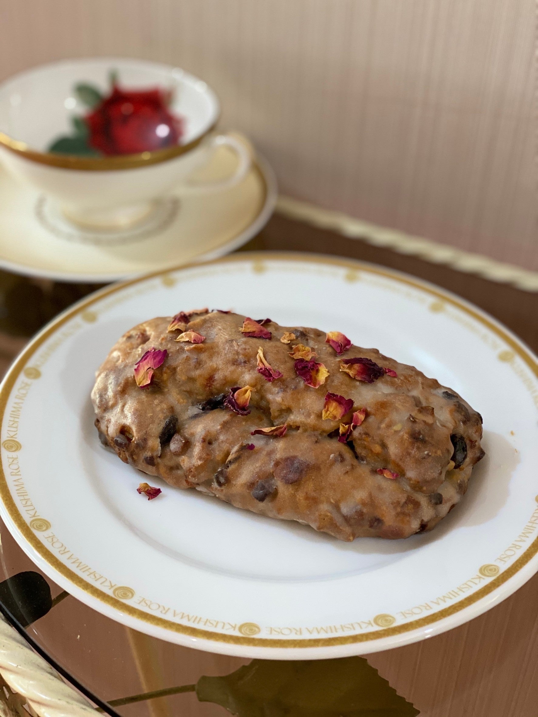 クリスマスアフタヌーンティーでは「食べるバラをふんだんに使用する」というコンセプトはそのままに、優雅なクリスマスを味わっていただくため、クリスマス限定のスイーツをご用意。メインの1つ「香るバラのシュトレン」は、イベントで販売した際にはすぐに売り切れてしまった大人気商品です。アーモンドやリンゴなど、バラ科の木の実のみを使用しているため、バラの香りを邪魔しないシュトレンになりました。また、もう1つのメイン、「香る赤バラのカップケーキ」は、着色に紅麴を使用している、見た目も美しいスイーツ。普段玖島ローズで販売しているカップケーキは淡いピンク色ですが、クリスマスカラーの赤は限定バージョンです。どちらもnagoya sugar art gallery(愛知県名古屋市)を主宰する、白砂朋子先生の手作り。見た目も中身もこだわりのバラスイーツで、特別なクリスマスをお過ごしください。