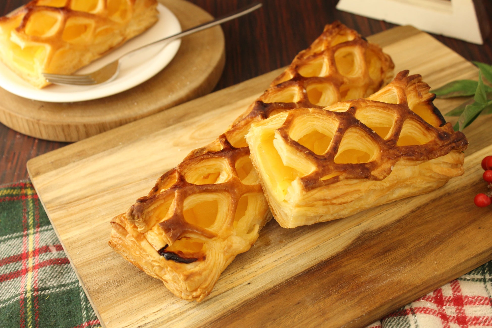 全長約24cmのなが~いパイ。サクッとしたパイの食感に、カスタードクリームとリンゴプレザーブは相性抜群。切り分けて、みんなでシェアするのがおすすめです。