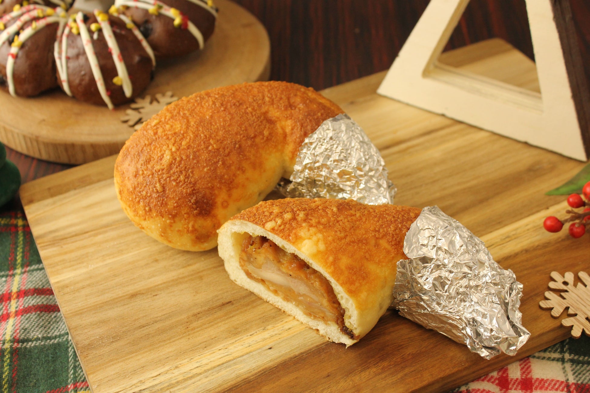 ルヴァン種を使用したフランスパン生地に、スパイシーなチキンとマスタードマヨを包み、見た目もまるでフライドチキンのように焼き上げました。パルメザンチーズの香りも食欲をそそる、思いきりかぶりついてもらいたい一品です。