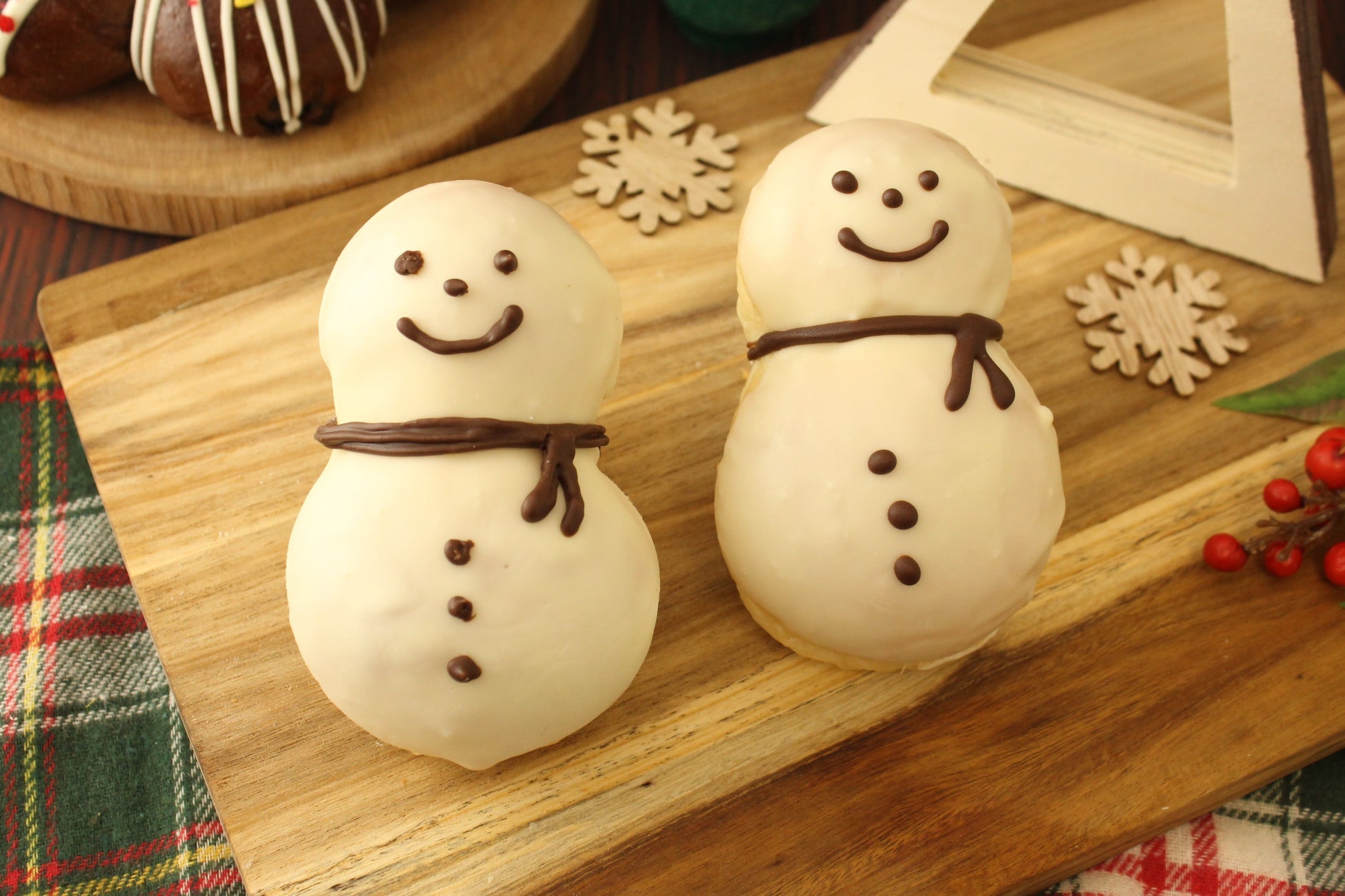 優しく甘い練乳クリームをサンドしたやわらかなパンに、真っ白な雪をイメージしてホワイトチョコをコーティングしました。仕上げにチョコレートで顔を描いたら、表情豊かな雪だるまのできあがり。