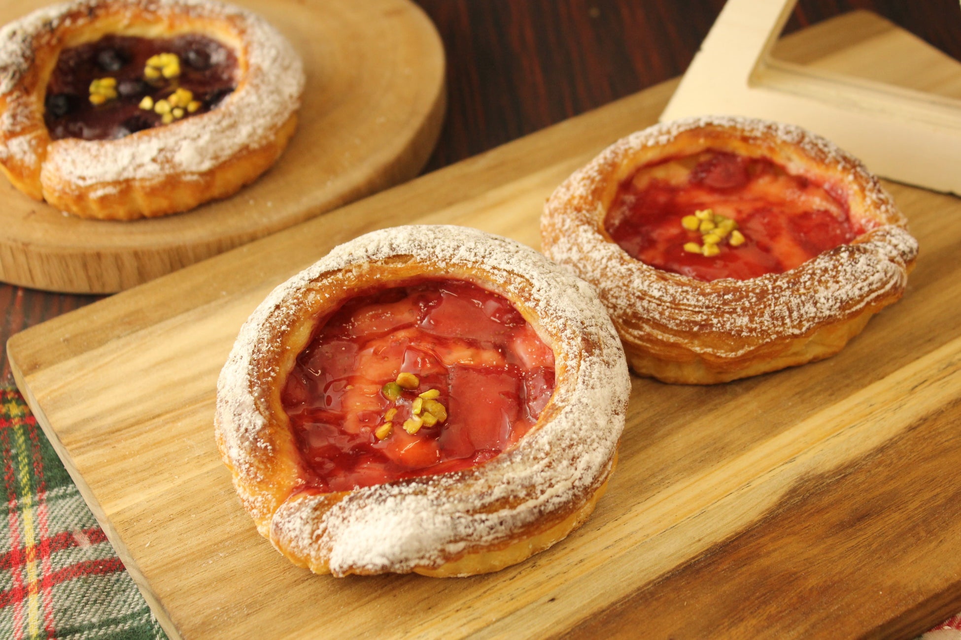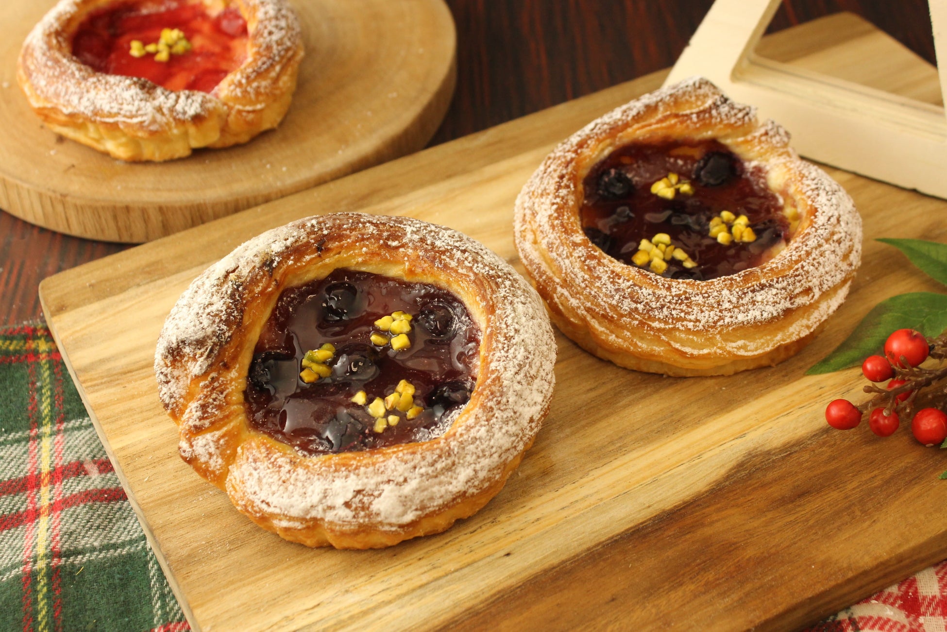 サクサクのデニッシュ生地にブルーベリー、ラズベリージャム、カスタードクリームをトッピング。クリームの甘さとフルーツの甘酸っぱさがバランスのいい、デザートにもぴったりなタルト風デニッシュです。