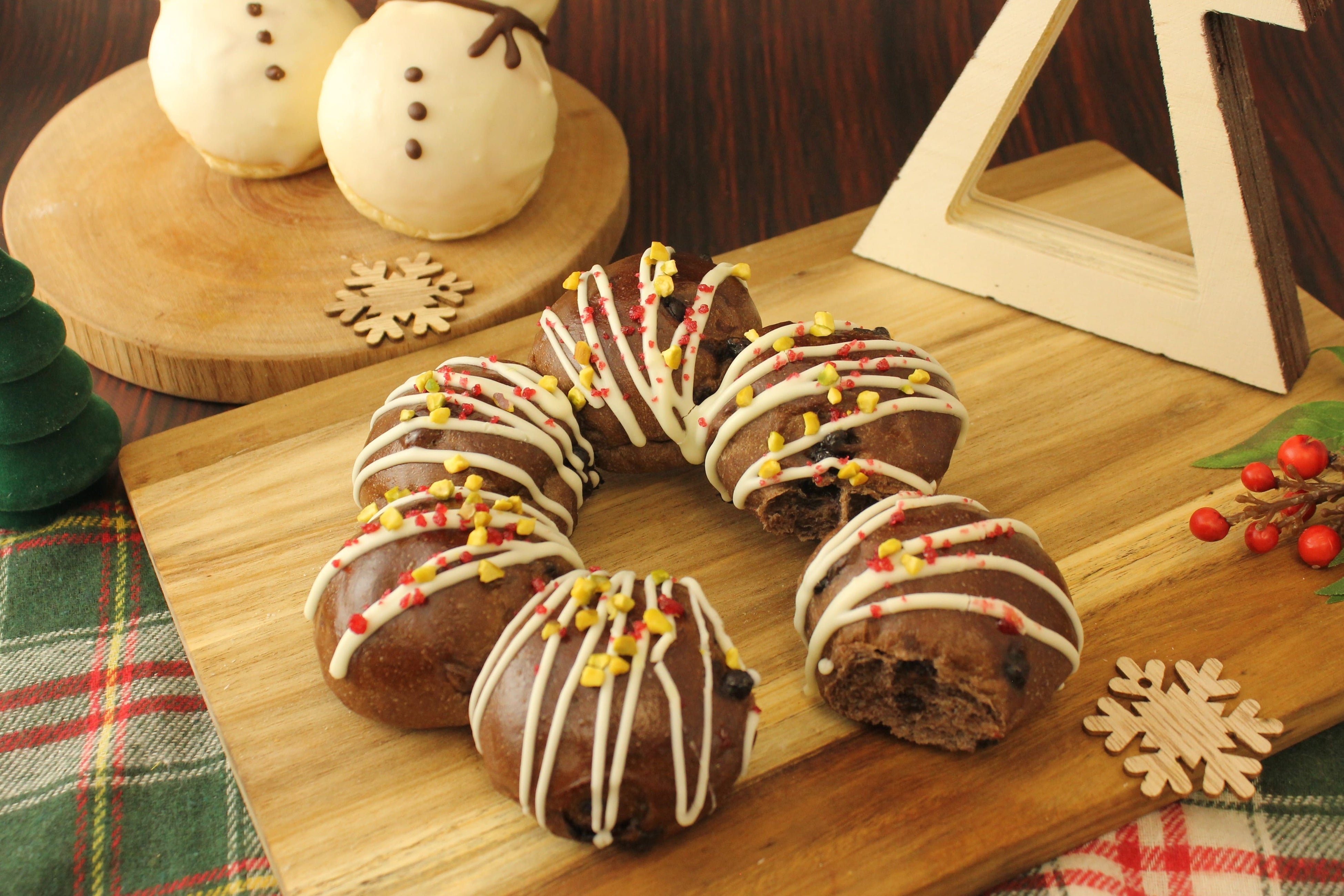 チョコレートの風味が豊かに香るチョコチップ入りのソフトな生地を、ホワイトチョコ、ピスタチオ、ラズベリー顆粒で飾りつけて、ちょっぴり豪華なクリスマスリースに見立てました。色とりどりな味わいを少しずつ楽しみたいちぎりパンです。