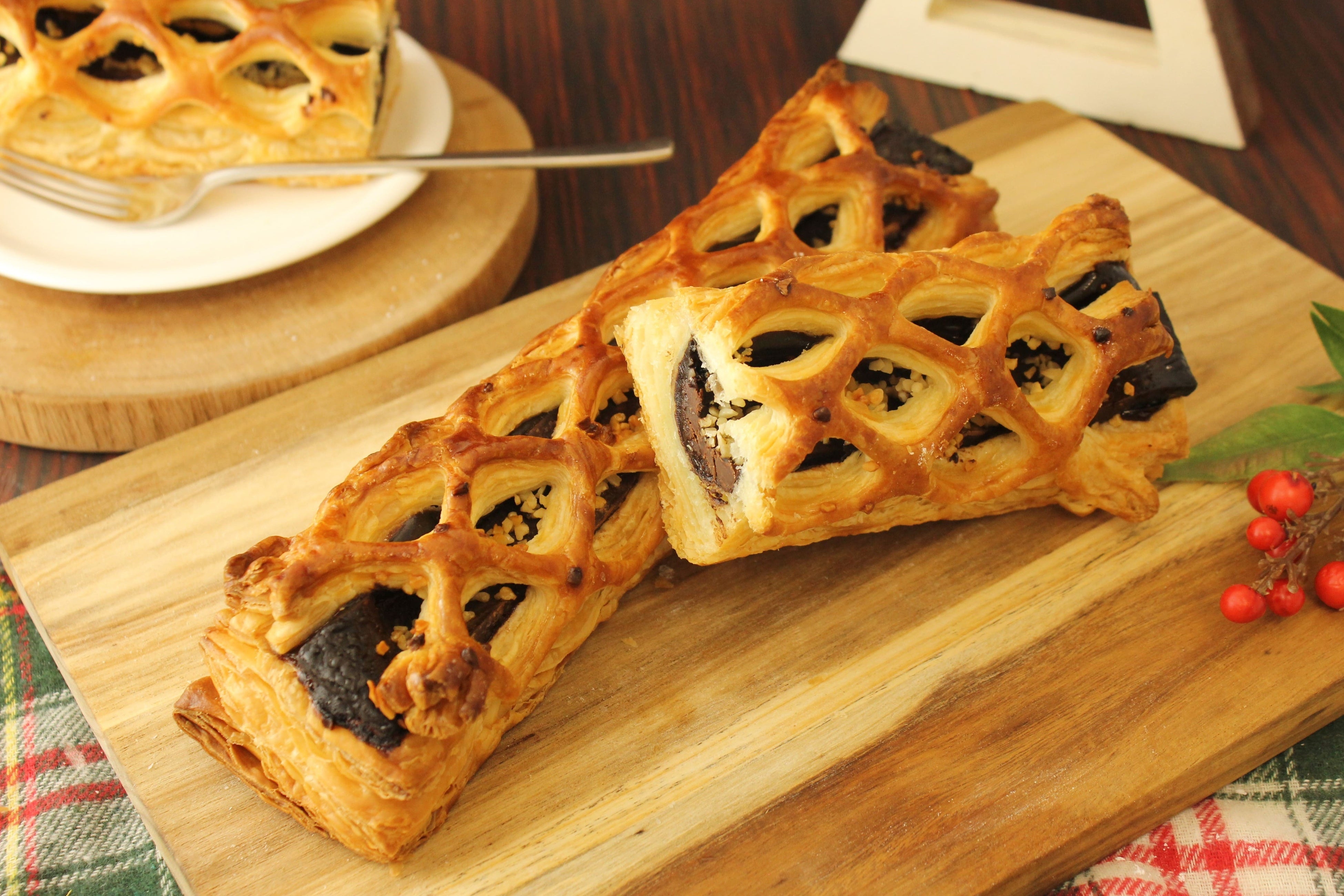全長約24cmのなが~いパイ。ビターチョコフィリングと板チョコに、アーモンドで香ばしさをプラス。お好みの大きさに切り分けられるので、あれもこれも食べたくなるパーティーにはもってこいです。