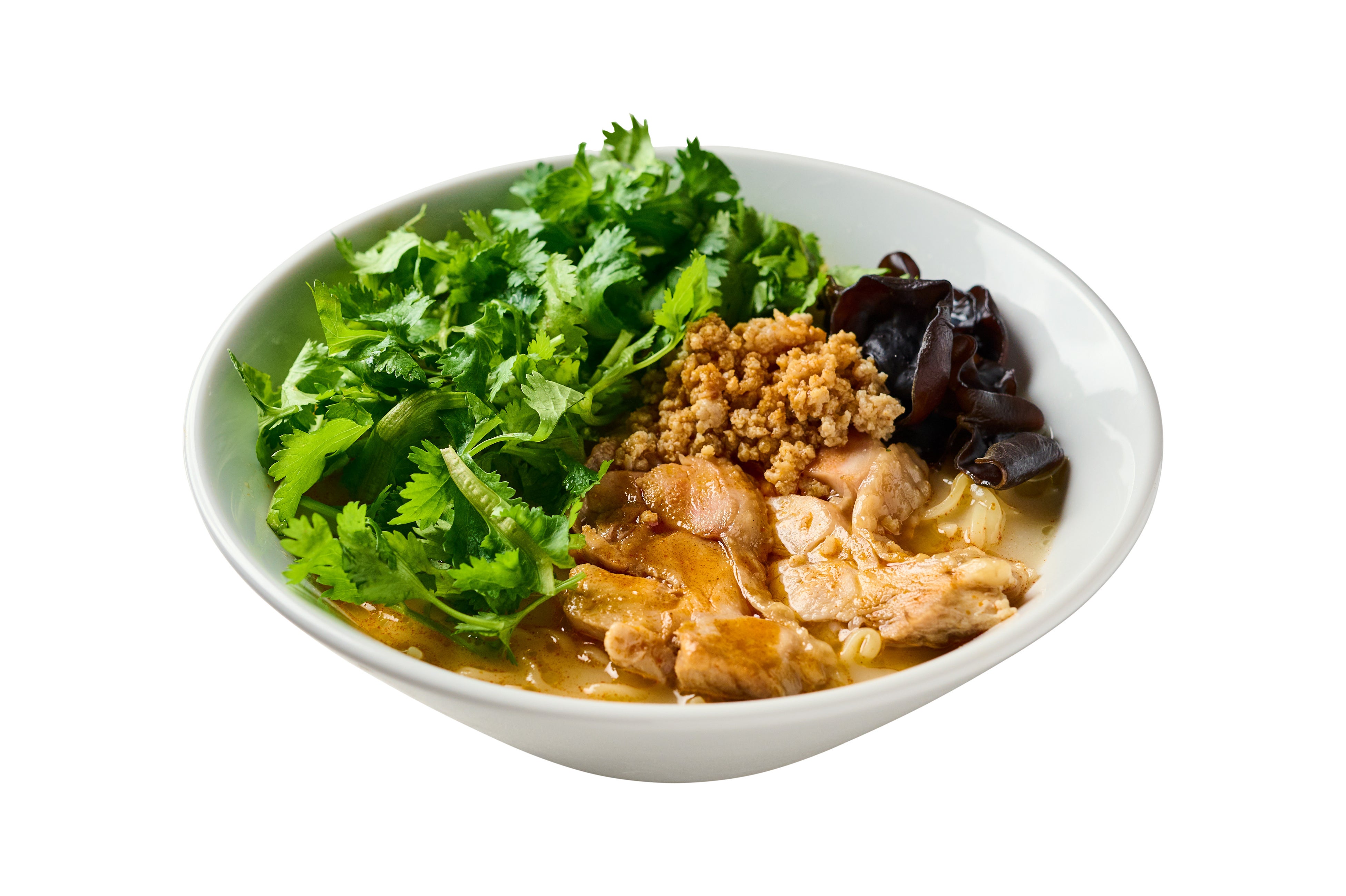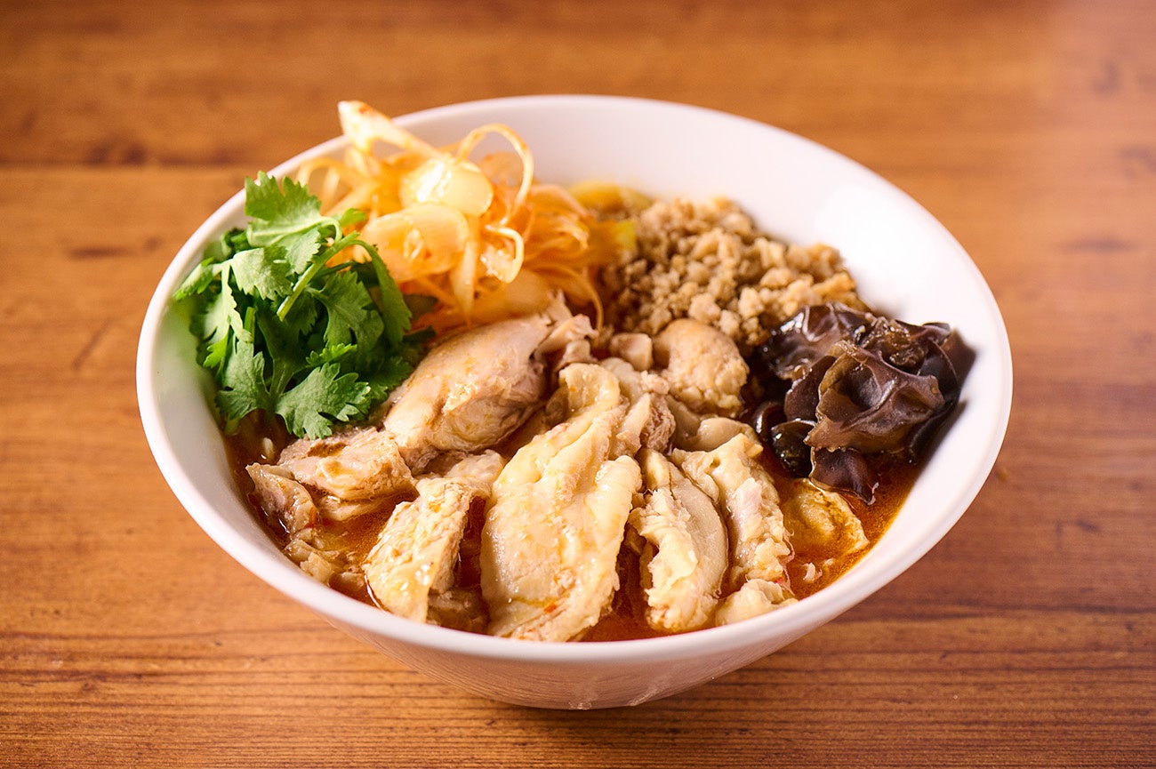 鶏チャーシューにパクチー・木耳・鶏そぼろが入ったオススメメニュー。