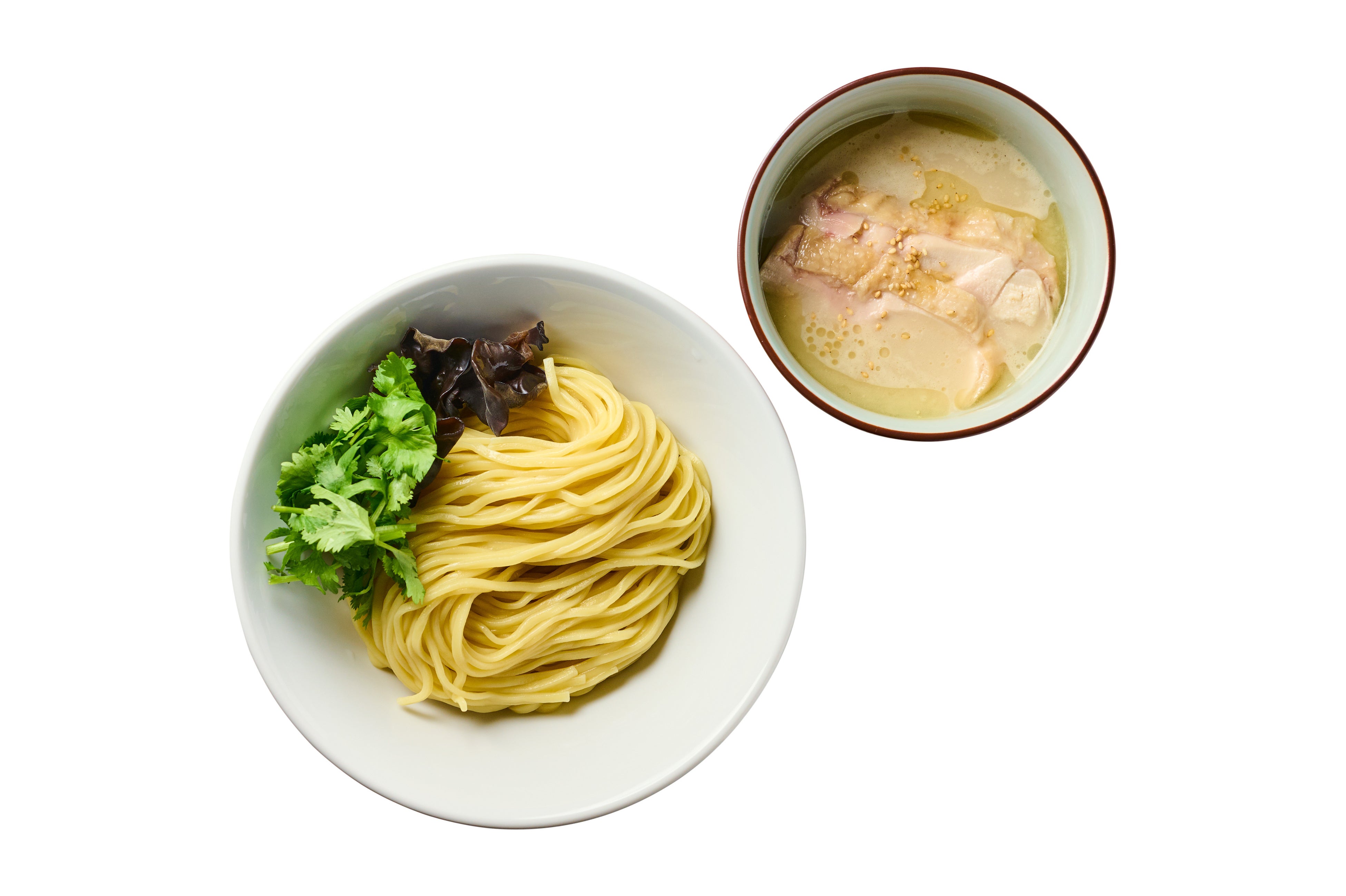 麺量350g(茹で上がり)と丁度よいサイズを盛り付け、丁寧に炊き上げた鶏チャーシューにパクチー、木耳のシンプルな厳選した食材を特製濃厚鶏白湯スープで召し上がっていただく、至高のつけ麺です。