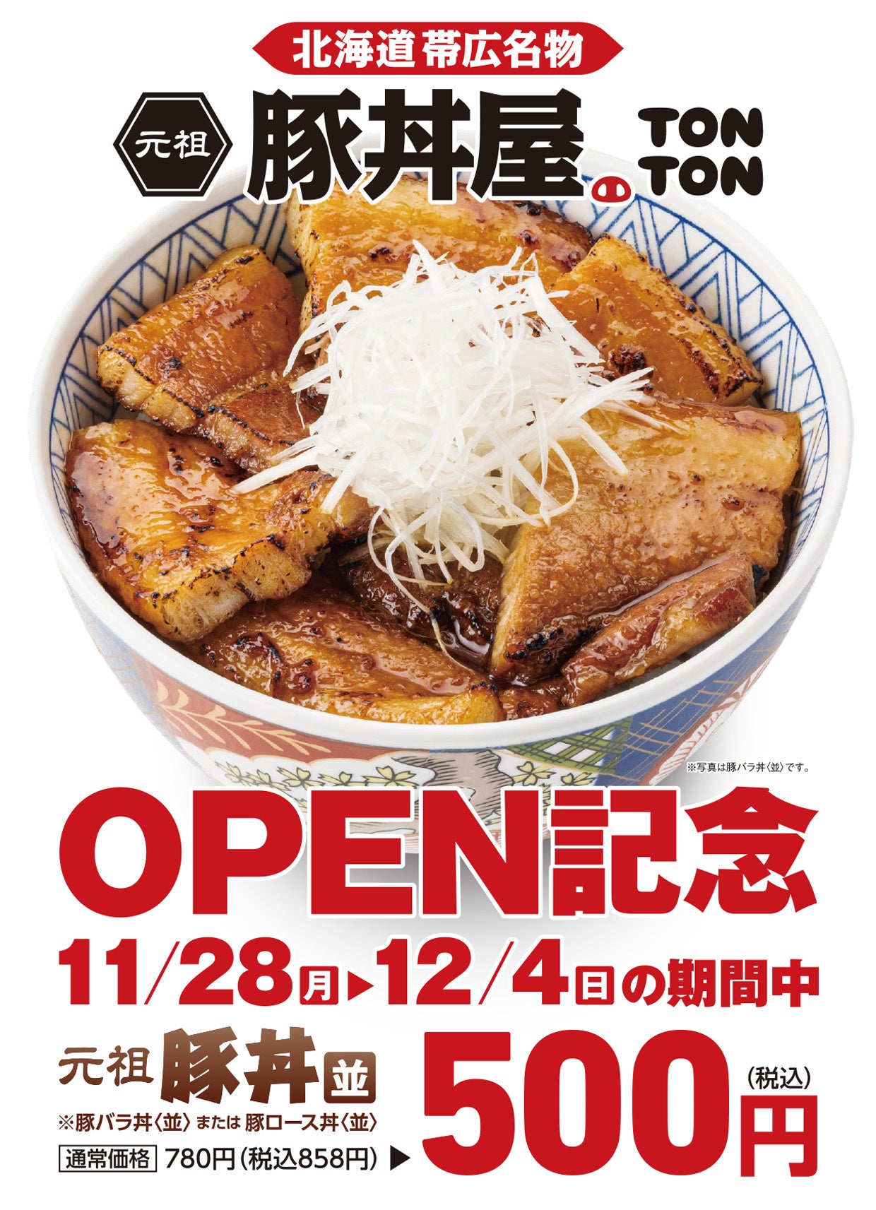 東三国店のオープンを記念して、11/28(月)〜12/4(日)の期間中、当店自慢の「豚バラ丼〈並〉」または「豚ロース丼〈並〉」を特別価格500円(税込)にて提供いたします。
