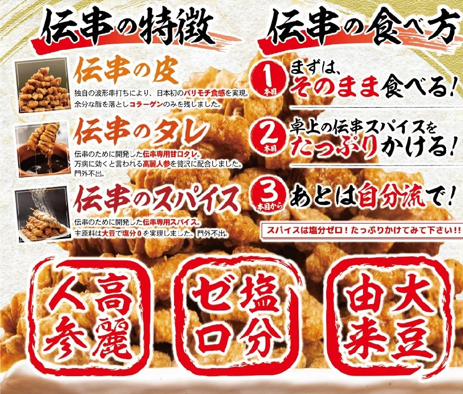 独自の波型串打ちにより“パリもち食感”を実現。調理工程で、余分な脂を落とした鶏皮はコラーゲンの宝庫。表面はパリパリ、中はモチモチとなり、何本でも美味しく食べられます。タレには万病に効くといわれる高麗人参を使用。甘口で美味しい自家製高麗人参タレと伝串の相性抜群です。旨さと健康を実現し、累計販売本数9000万本を超える大ヒット商品となりました。また、鶏皮串の製造特許に加えて、多くの登録商標を持ち、『伝串』は新時代でしか味わえない唯一無二の商品となりました。
