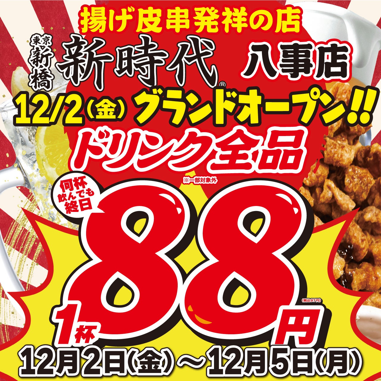 「新時代 八事店」のオープンを記念し、ドリンク全品を1杯88円(税込97円)でお楽しみ頂けるキャンペーンを開催します。
