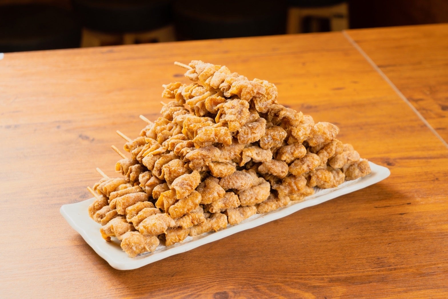 ブラジルの元プロサッカー選手の『佐野直史』が開発した「伝串®」。特許庁からも認められた唯一無二の揚げ皮串。