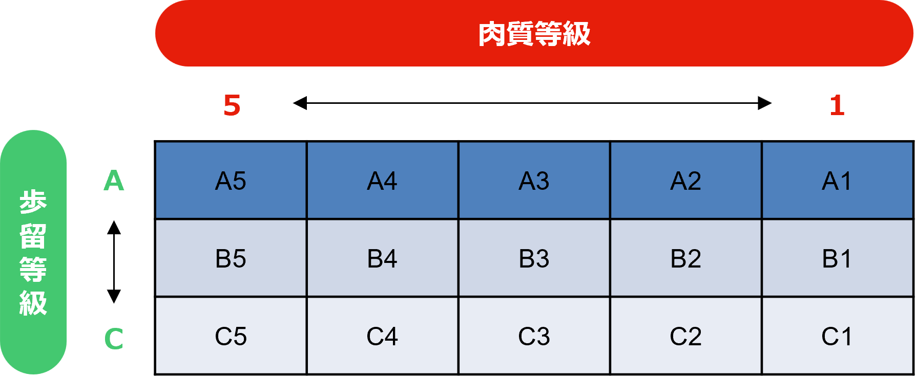 「A~C」は歩留まりの等級で1頭から得られるお肉の量を表し、Aが最も最高ランクとされています。また、「5~1」は肉質の等級を表し、お肉の締まりや色とともに脂肪の質を評価しています。5が最もきめが細かい霜降りのお肉のことを指しています。