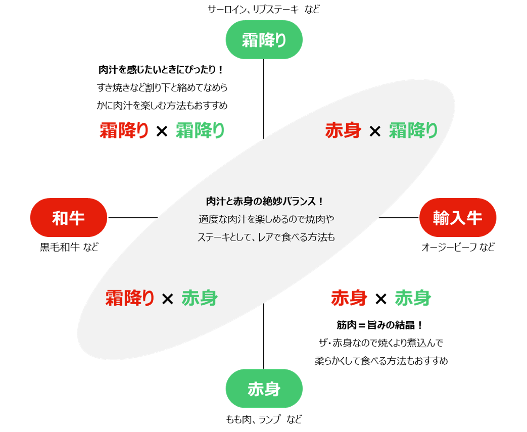 お肉の種類はたくさんありますが、その中から自分好みの「いいお肉」を選ぶコツは、「牛の品種×部位」で見るのもひとつです。大きく分けて和牛か輸入牛か、そして霜降りか赤身かといった四象限で考えると選びやすくなります。