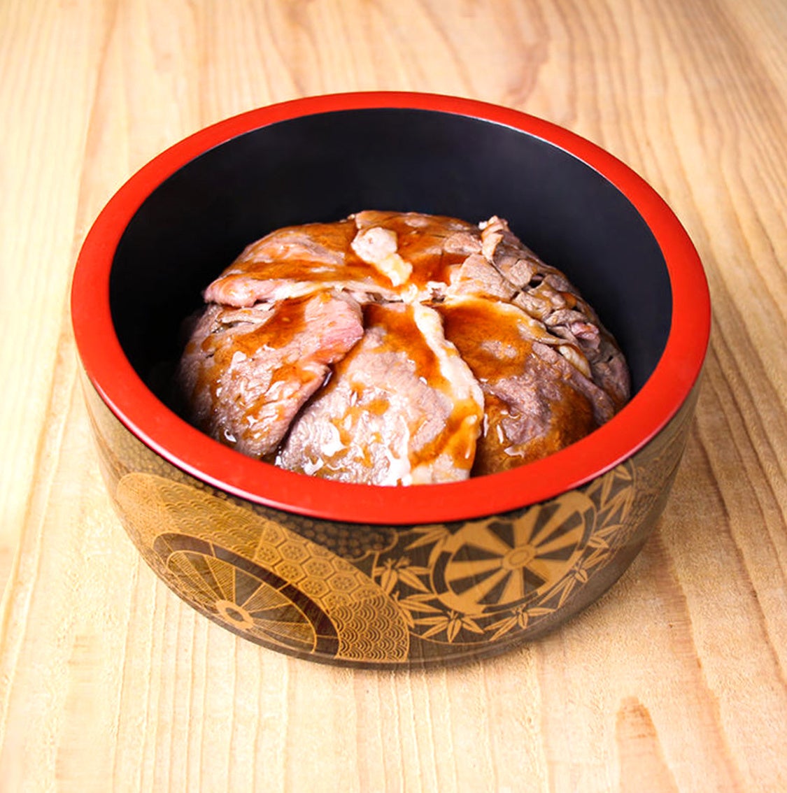 肉味が濃く、肉の旨みを感じやすい和牛ブリスケ(肩バラ)を使用した丼です。甘めの醤油ダレで味付けしています。
