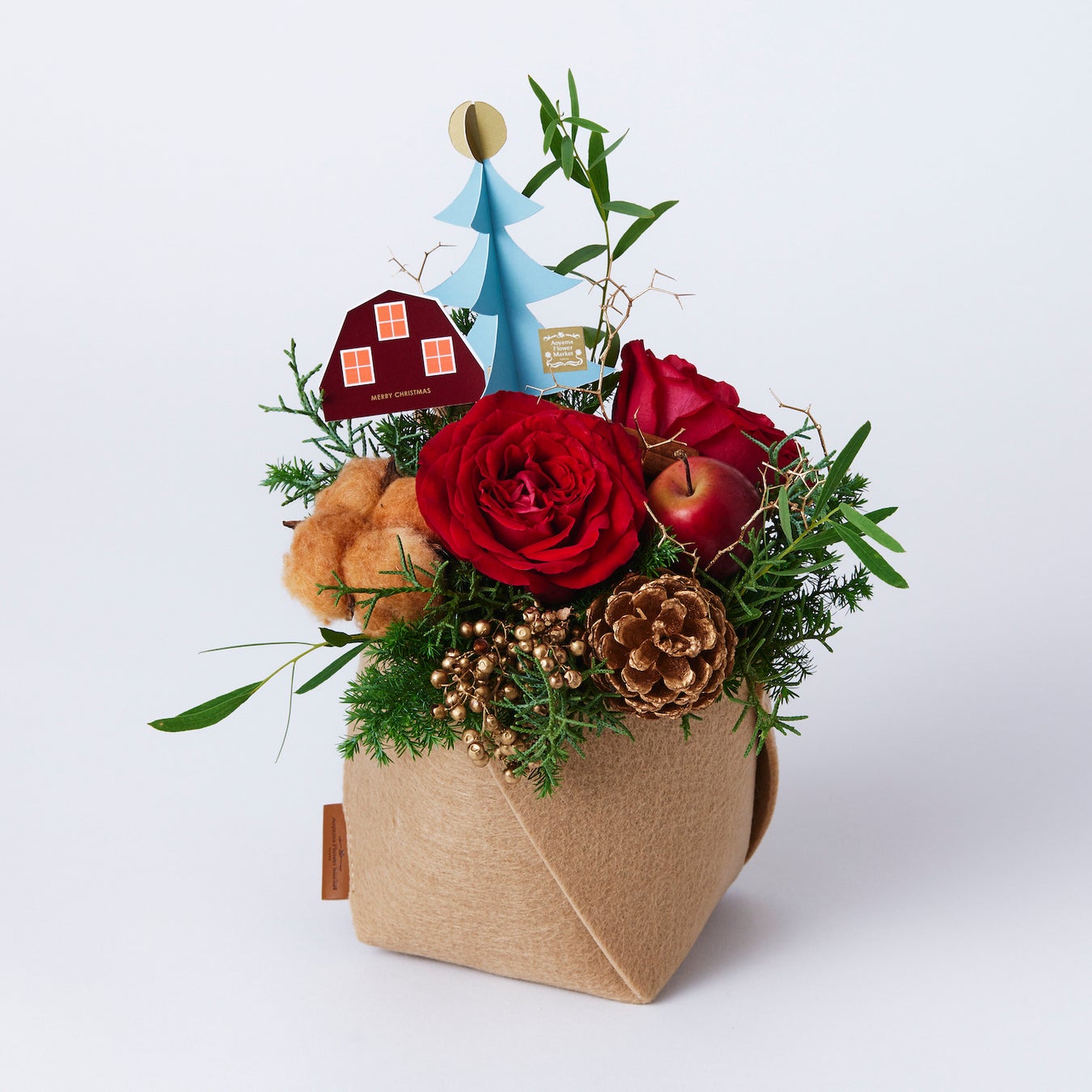アロマ香るコニファーやシナモンなど、五感に訴える素材使いのフラワーアレンジメント。家で過ごす時間がHAPPYになるような、ハウス形のオーナメント付き。