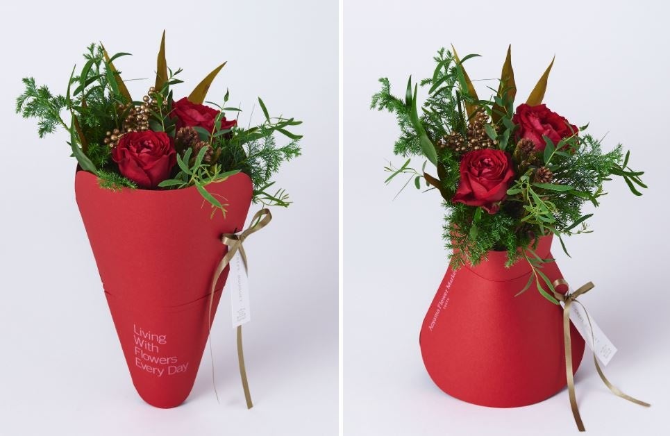 まるでクレープのような形のブーケは、パッケージを切り離して組み立てると花瓶に早変わりする優れもの。ホリデーシーズン限定カラーが登場。