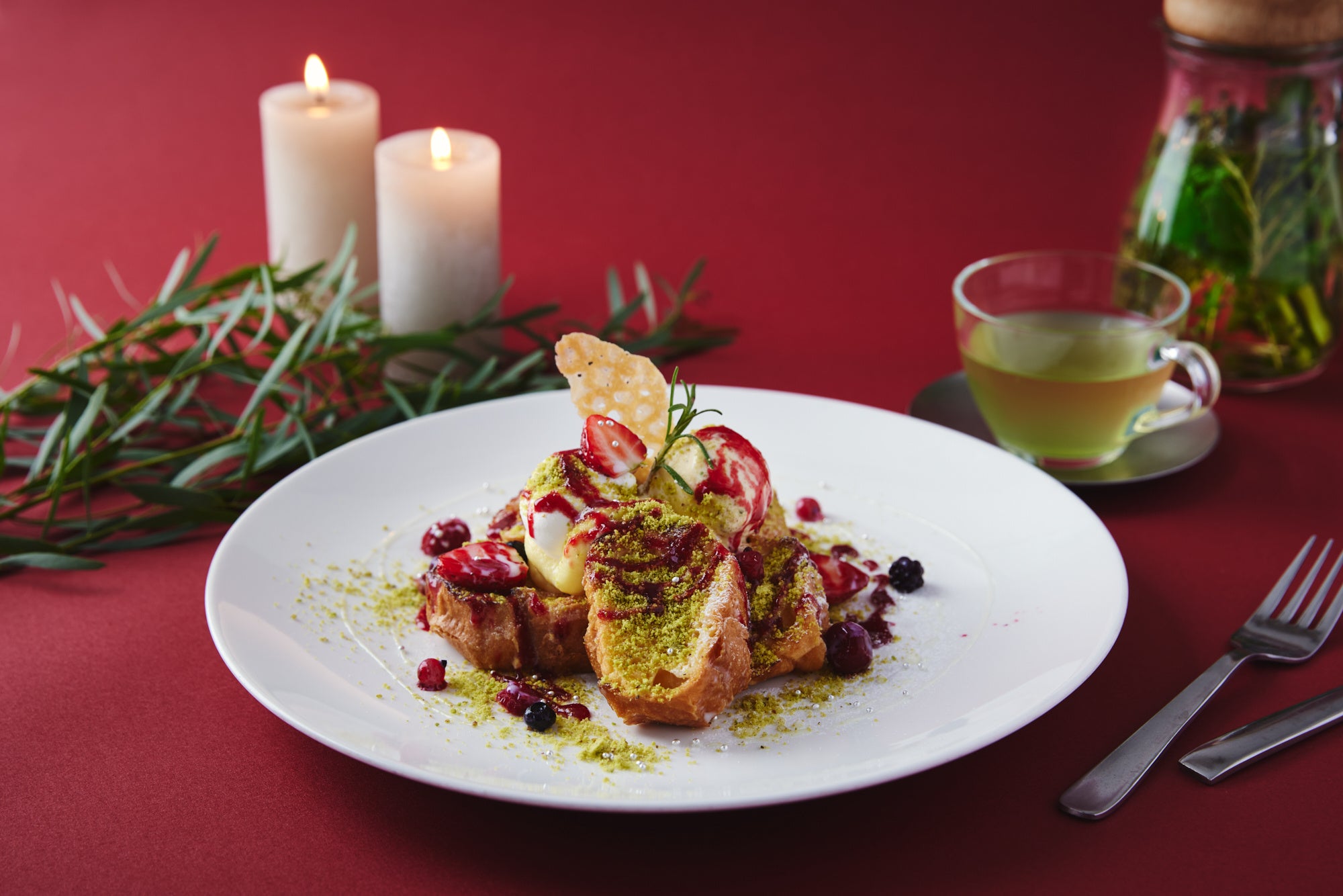 アパレイユにじっくり漬け込んで焼き上げる自家製フレンチトーストを、スペシャルバージョンでご用意しました。ピスタチオの緑に、真っ赤なミックスベリーが映えます。甘く煌めく、クリスマス期間限定の一皿です。