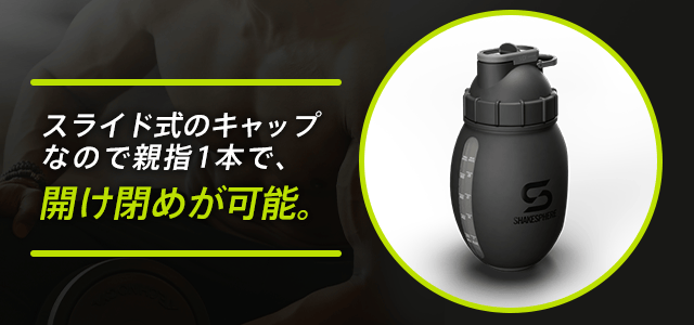 また、親指1本で開け閉めが可能なスライド式キャップなので、必要な時に素早くプロテインを摂取できます。