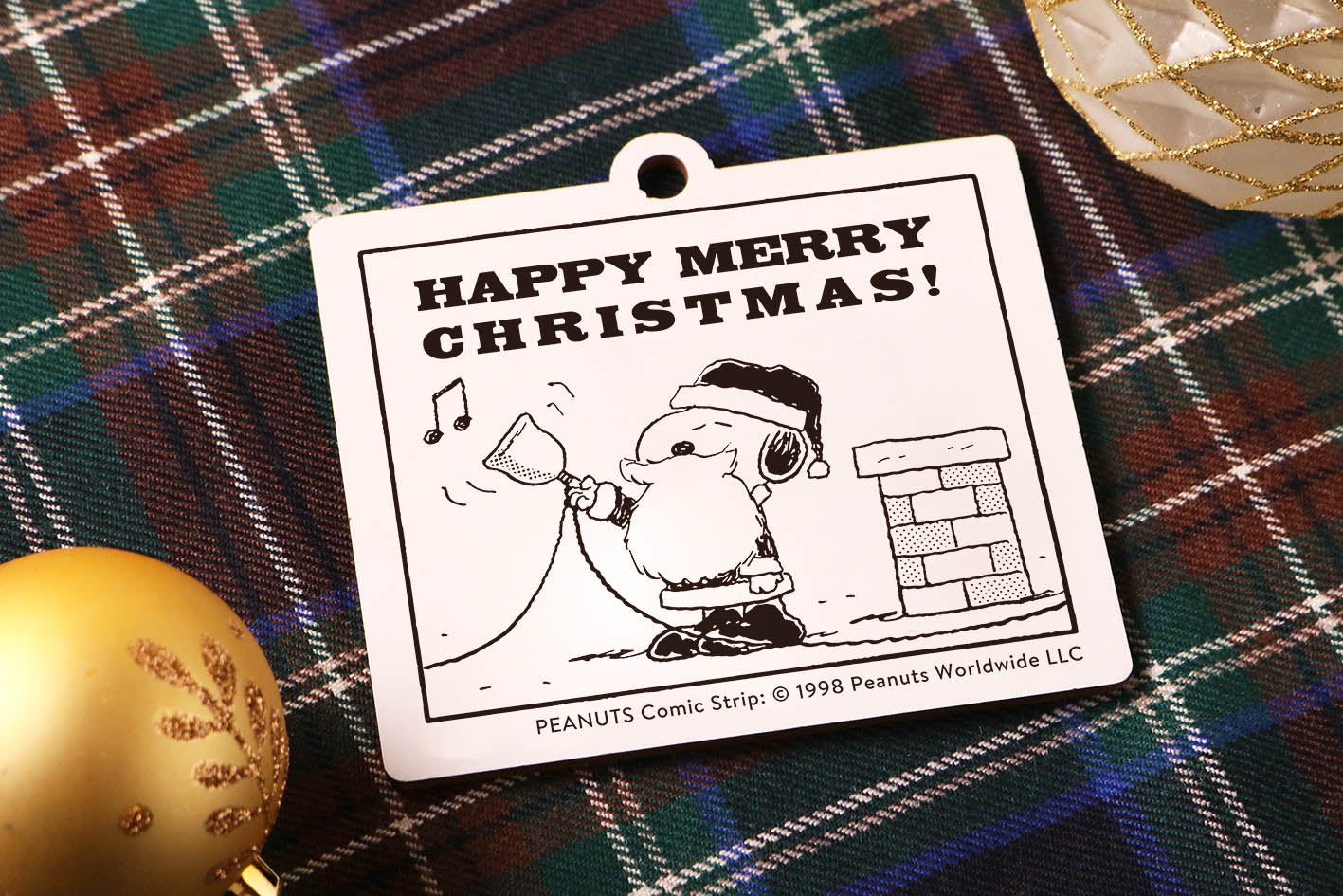 ノベルティの木製オーナメントは、サンタクロースに変装してベルを鳴らすスヌーピーのアートが施されたデザインになっています。