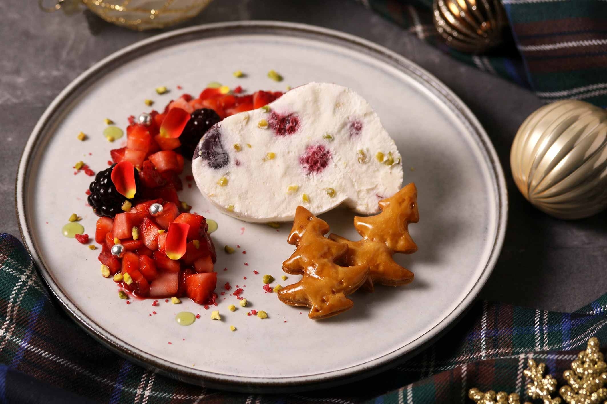 ベリーやナッツが入ったさっぱりさわやかなヨーグルト風味のメレンゲデザート。ライムの皮とバラを散りばめてフレッシュな香りと華やかさをプラス。