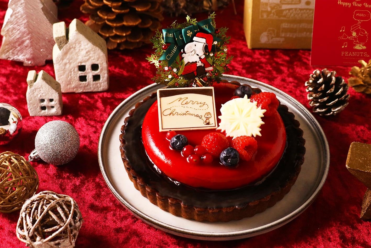 真っ赤なグラサージュに、スヌーピーのオーナメントやチャーリー・ブラウンのメッセージプレート、ベリーのトッピングで上品さと大人っぽさを感じるデザインに仕上げました。