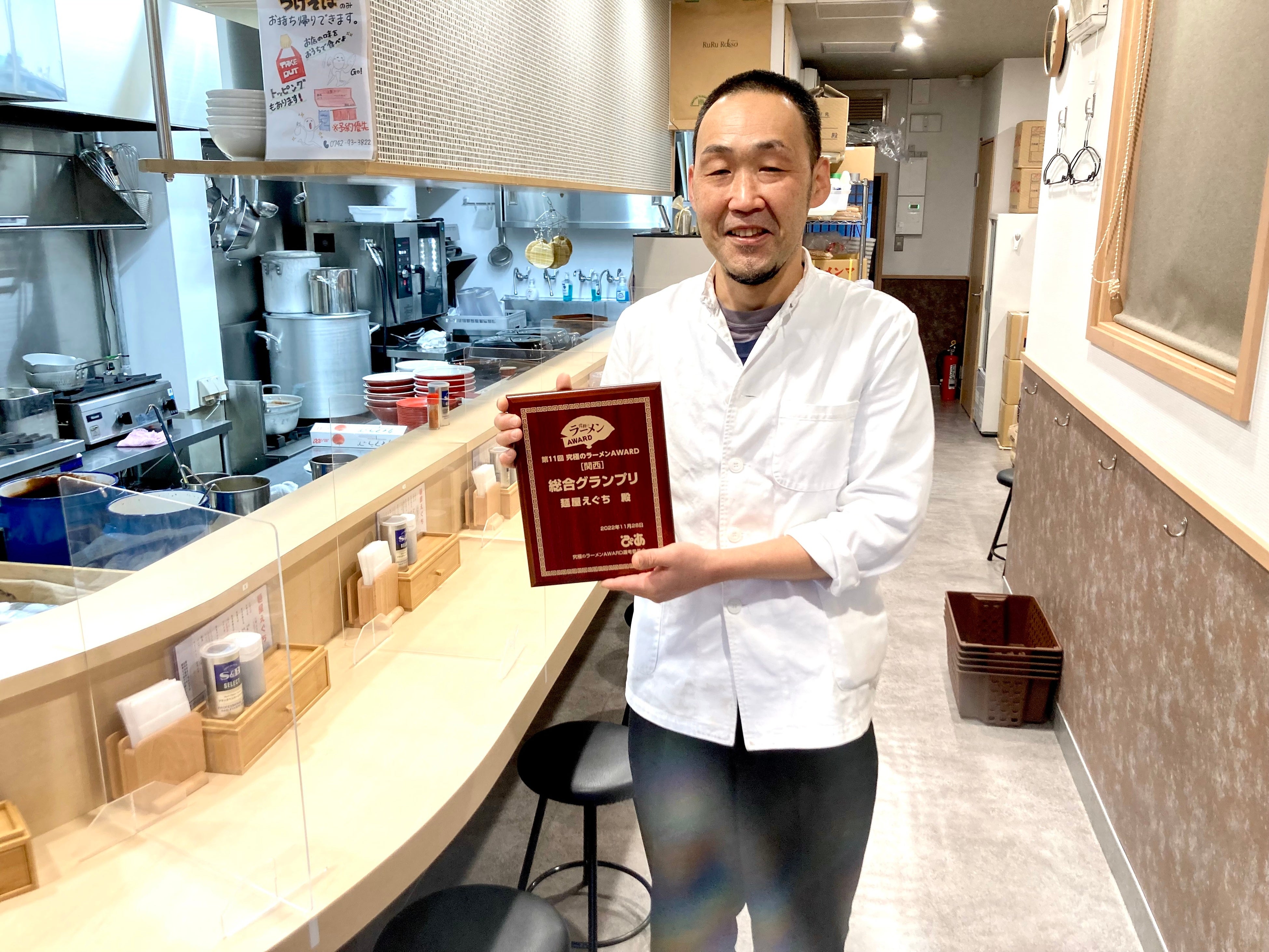グランプリの記念盾が贈呈され、店主の江口卓哉さんは「受賞は皆様のおかげです。本当にありがとうございます」と、喜びをかみしめた。また、新店をはじめ、醤油、塩、豚骨、鶏白湯、味噌、つけ麺、バラエティなどの各部門のグランプリ&準グランプリ店も同時に発表。今回も関西のラーメンシーンの最新トレンドが分かる、興味深いラインナップとなっている。