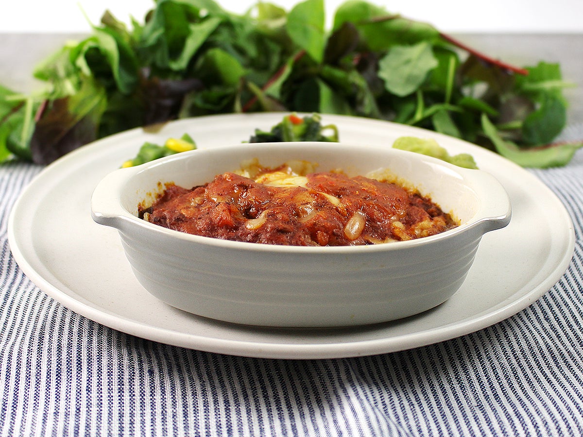 玄米を使用したミートドリアです。ソースの下にとろけるチーズを挟んでおり、トロっと伸びる食感をお楽しみいただけます。粗挽きの牛ミンチを使用しているため牛肉の旨味も充分に堪能できるプレートとなっております。