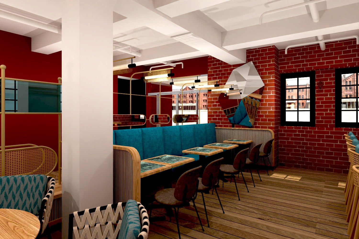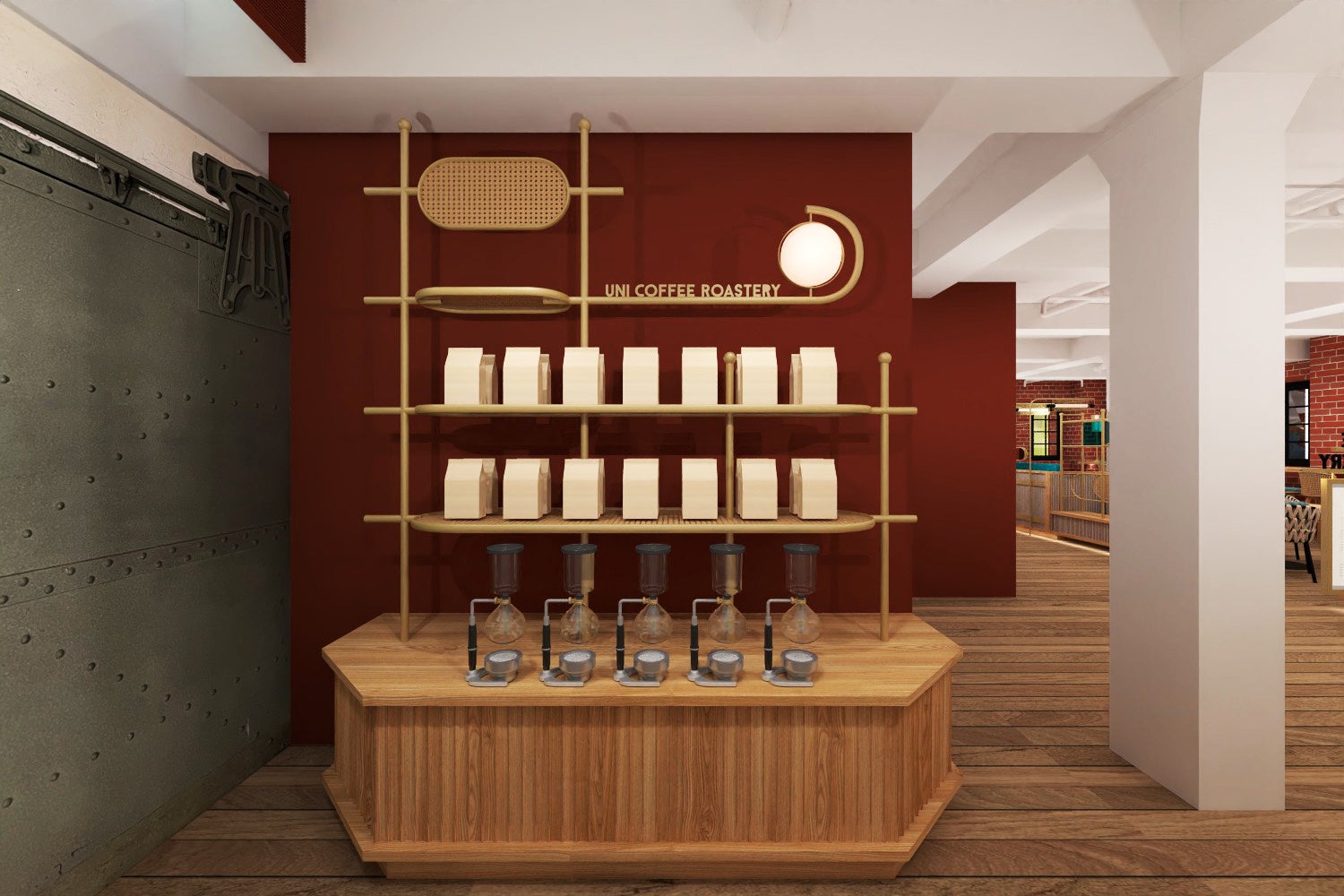 「UNI COFFEE ROASTERY 横浜赤レンガ倉庫」でも、赤レンガの風合いを活かし、ビンテージ感ある色合い、インテリアをチョイス。歴史ある横浜赤レンガ倉庫のリニューアルにあわせて、”古くて新しい”空間に仕上げました。