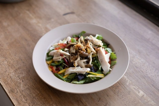 柔らかい食感に仕上げたチキンに3種のキノコを贅沢に合わせた旨味たっぷりのサラダです。