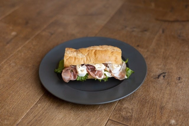 生ハムの塩気と、香り深いカマンベールチーズ、アクセントにブラックペッパーを合わせた定番のサンドです。