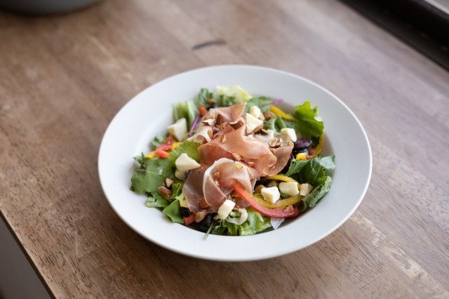口当たり柔らかな生ハムとカマンベールチーズ、アクセントにナッツを使用した栄養たっぷりのヘルシーなサラダです。