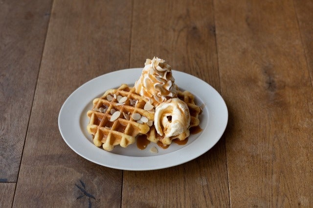 コクのある香ばしいキャラメルソースに濃厚なバニラアイス、生クリームを添えた温かいワッフルです。