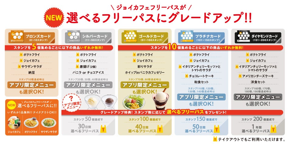 スタンプカード特典のフリーパスが「ジョイカフェ」、「ポテトフライ」、「サウザンサラダ」の中から