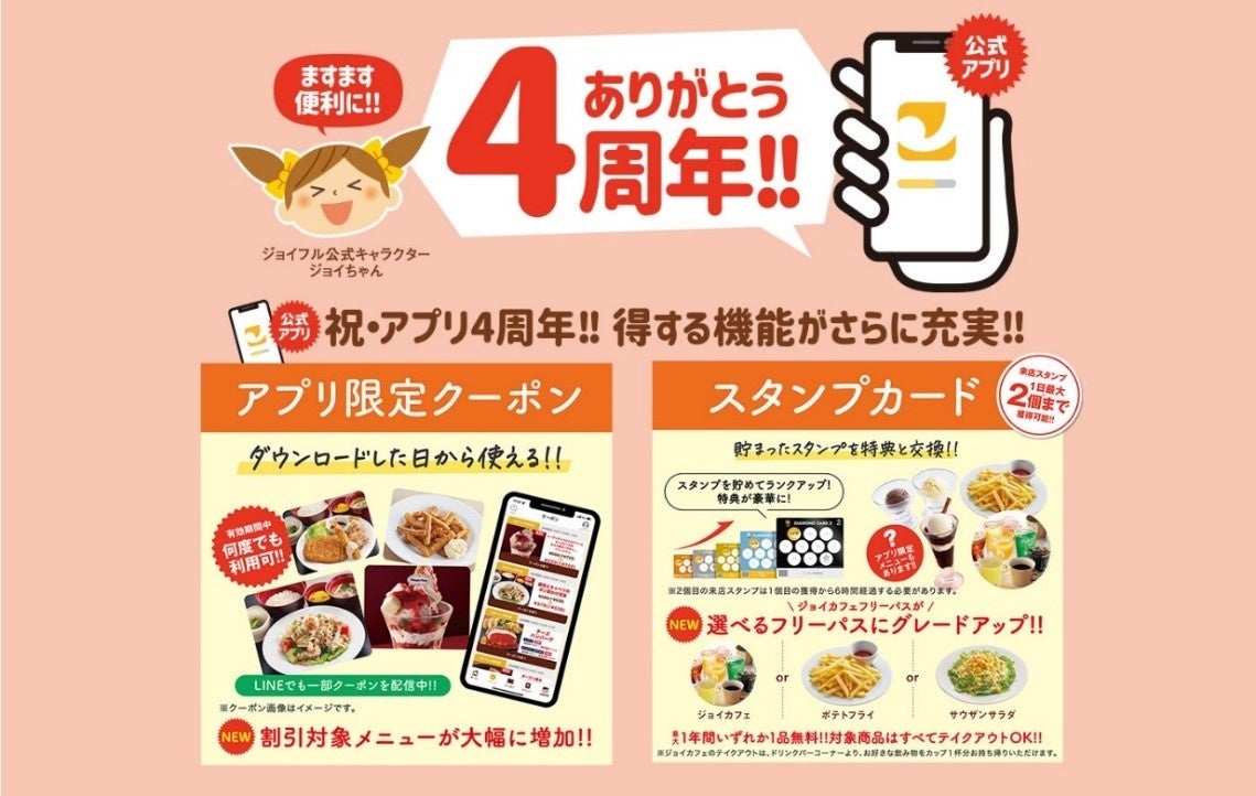 ジョイフル公式アプリ4周年を記念し、「ジョイフルデジタルお食事券1,000円分」が抽選で50名の方に当たるキャンペーンを開催します。
