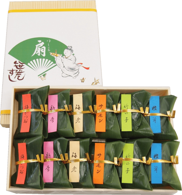 創業1967年(昭和42年)以来、多くのファンにご愛顧いただいております、山海の食材を笹の葉で包んだ、一口サイズの優美なお寿司でございます。一つ一つ手作りにてお作りしております。