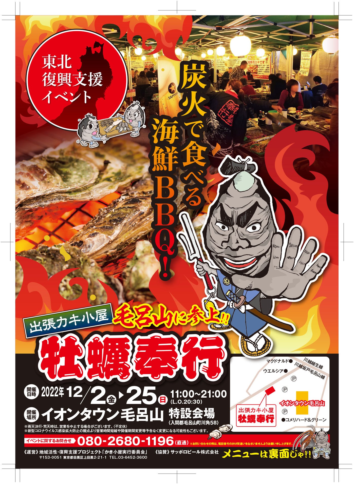 宮城県石巻の牡蠣をセルフ炭火焼き(海鮮BBQ)で楽しむ「出張カキ小屋 牡蠣(かき)奉行」(TEL080-2680-1196)がイオンタウン毛呂山(埼玉県毛呂山町)に期間限定オープン。期間は12月2日〜12月25日