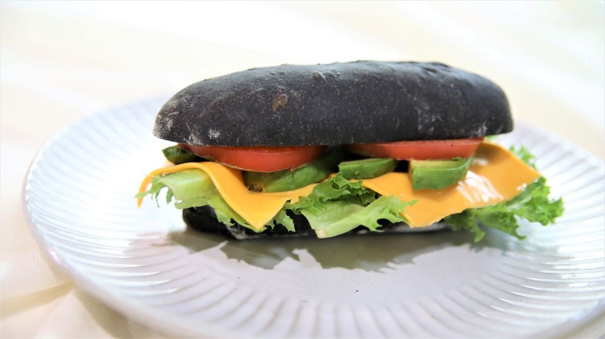 今までにあまりなかったイカスミパンのサンドウィッチ。トマトやレタス、チーズなどの具材を挟めば、映えること間違えなし。