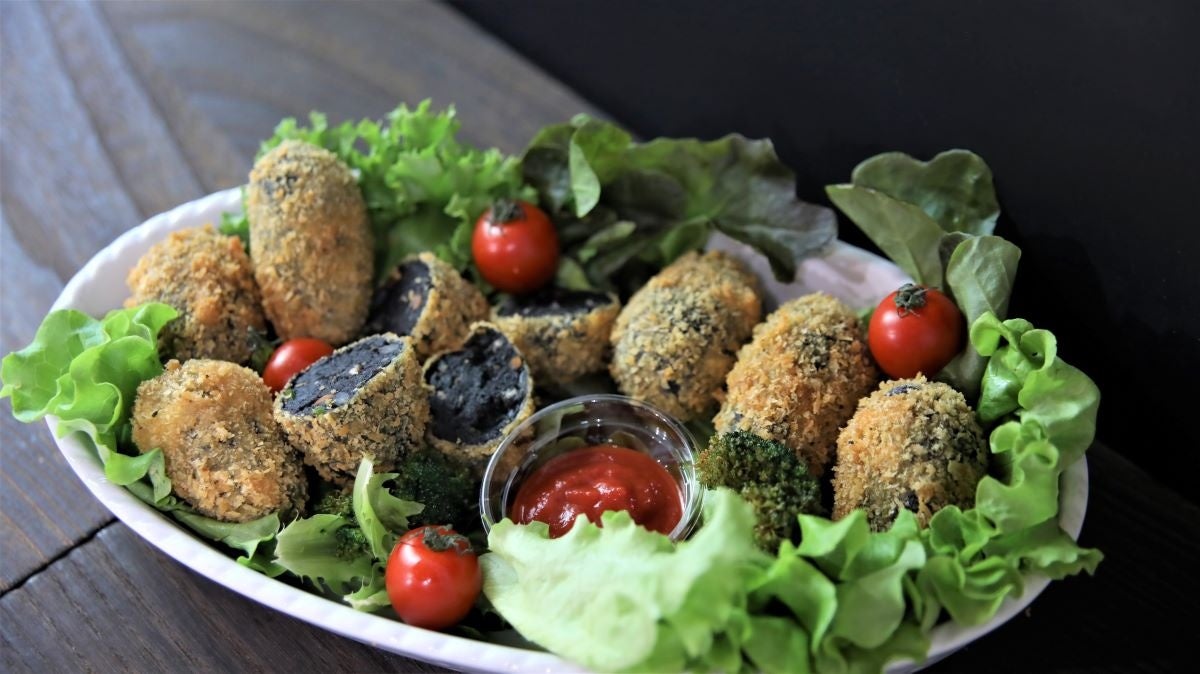 茹で上がったじゃがいもに、お好みの具材とイカスミペーストを混ぜ合わせるだけ。普段食べているコロッケにコクが出て、目でも味でも楽しめるコロッケです。