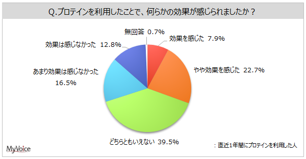 直近1年間のプロテイン利用者のうち、効果を感じた人は「効果を感じた」「やや効果を感じた」を合わせて3割強です。
