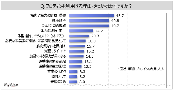 直近1年間にプロテインを利用した人に、利用する理由・きっかけを聞いたところ(複数回答)、「筋肉や筋力の維持・増強」「健康維持」「たんぱく質の摂取」が各40%台です。