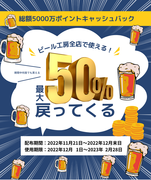 株式会社柴田屋ホールディングス(本社:東京都中野区、代表取締役:柴 泰宏)の傘下である、株式会社麦酒企画(本社:東京都中央区/代表取締役社長:柴 健宏)が運営するビール工房は、半額キャッシュバックキャンペーンを全店で実施いたします。