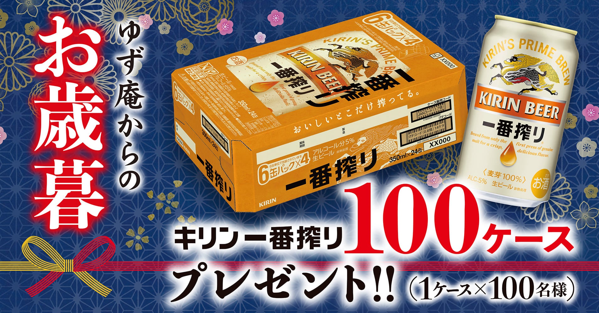『寿司・しゃぶしゃぶ ゆず庵』は、お客様の日頃のご愛顧に感謝して、『ゆず庵』からのお歳暮として「キリン 一番搾り 350ml×1ケース(24本)」を、100名様にプレゼントいたします。ご応募は『ゆず庵』公式アプリをダウンロードし、会員登録後にアプリ内キャンペーン特設ページから応募するだけ!ぜひお気軽にご参加ください。