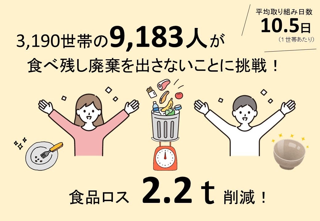 「食べ残しゼロ運動 5日間チャレンジ」では、食べ残し廃棄を出さなかった日数をカウントし、専用の応募フォームへ申告してもらいました。その結果、期間中にのべ9,183名の参加がありました。1世帯当たりの平均日数は10.5日で、呼びかけた5日の倍以上となっています。