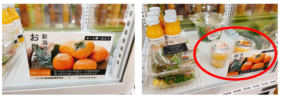 今回は新潟県産「おけさ柿」を実食いただく機会を作るため、その場で簡単に食べられるようカットした小分けカップを準備し、オフィスに設置した冷蔵庫にてサンプリングを実施いたしました。