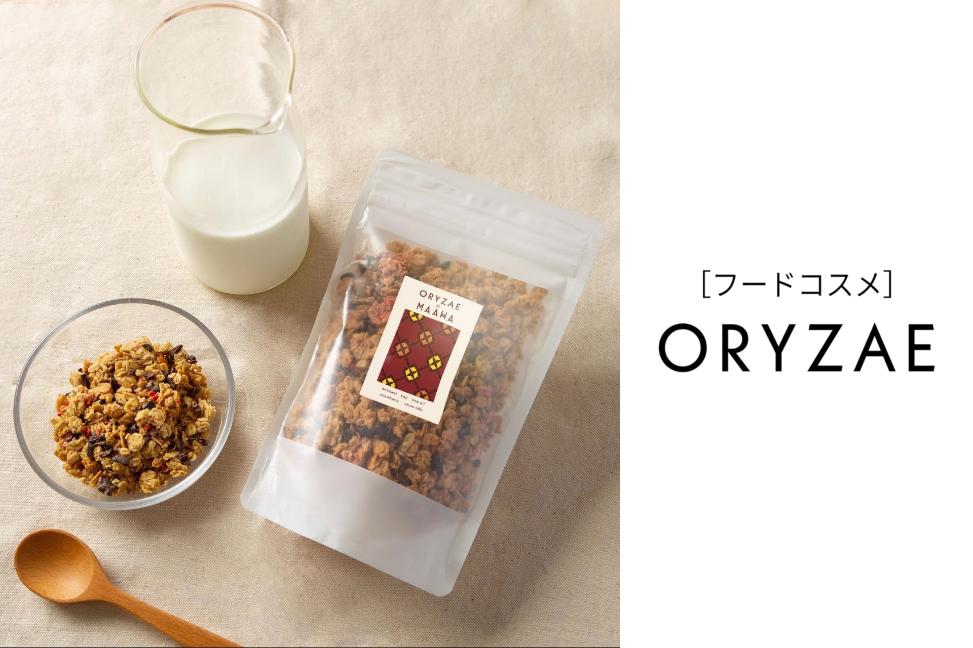 「ORYZAE × MAAHA GRANOLA プレーン&カカオニブ」は、食品におけるサステナブル商品へマイナスイメージを払拭し、私たちが「美味しい」を我慢することなく、誰かに我慢を強いることもない、新たな選択肢として誕生しました。「甘いしあわせ」を我慢せずに、コメ農家の経済課題や砂糖の過剰摂取による健康リスクなどの問題を解決する米麹由来発酵糖分「ORYZAE(オリゼ)」と、高品質のチョコレートを通じて、ガーナのカカオ産業を改革する「MAAHA CHOCOLATE」のカカオニブとのコラボレーションにより、”美味しくてハッピーなサステナブルアクション”をカタチです。