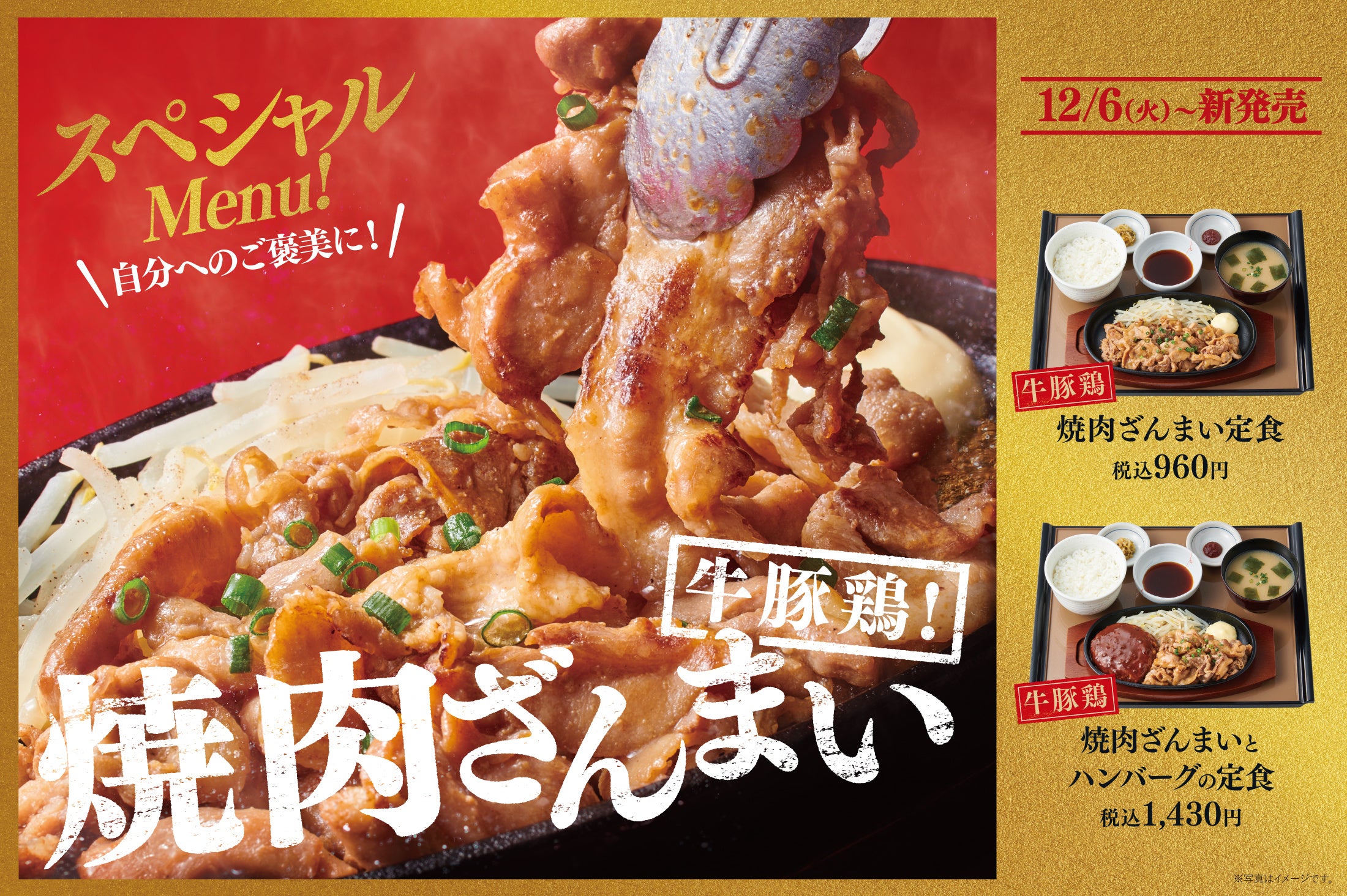 また、焼肉をお腹いっぱい頬張りたい方のための『【牛豚鶏】倍盛・焼肉ざんまい定食』1,590円、ハンバーグを“チーズハンバーグ”にした『【牛豚鶏】焼肉ざんまいとチーズハンバーグの定食』1,480円,『おうち定食』の『[テイクアウト]【牛豚鶏】焼肉ざんまい』も販売します。一年間頑張った自分へのご褒美に、スペシャルな定食をお楽しみください。